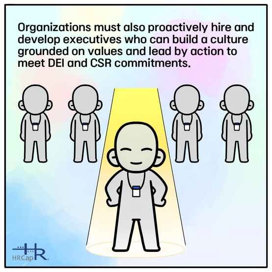 Organizations must also continuously hire and develop talent who will prioritize building a culture grounded on values and lead by action to meet DEI and CSR commitments. After all, we all want to work for a leader who continuously inspires and genuinely supports our values.