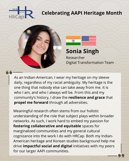 Most importantly, we have celebrated AAPI Heritage Month by highlighting our HRCap employees leading the forefront of recruiting and research. We asked our employees to reflect on their AAPI heritage and how it shaped them into the person they are today and how it has assisted them in the work that they do at HRCap. Everyone had different stories on how their culture has widened their perspective or strengthened their character. Though some were indifferent to their culture growing up, they have developed greater cultural appreciation during their journeys with HRCap, becoming even more motivated to empathize and collaborate with others.
